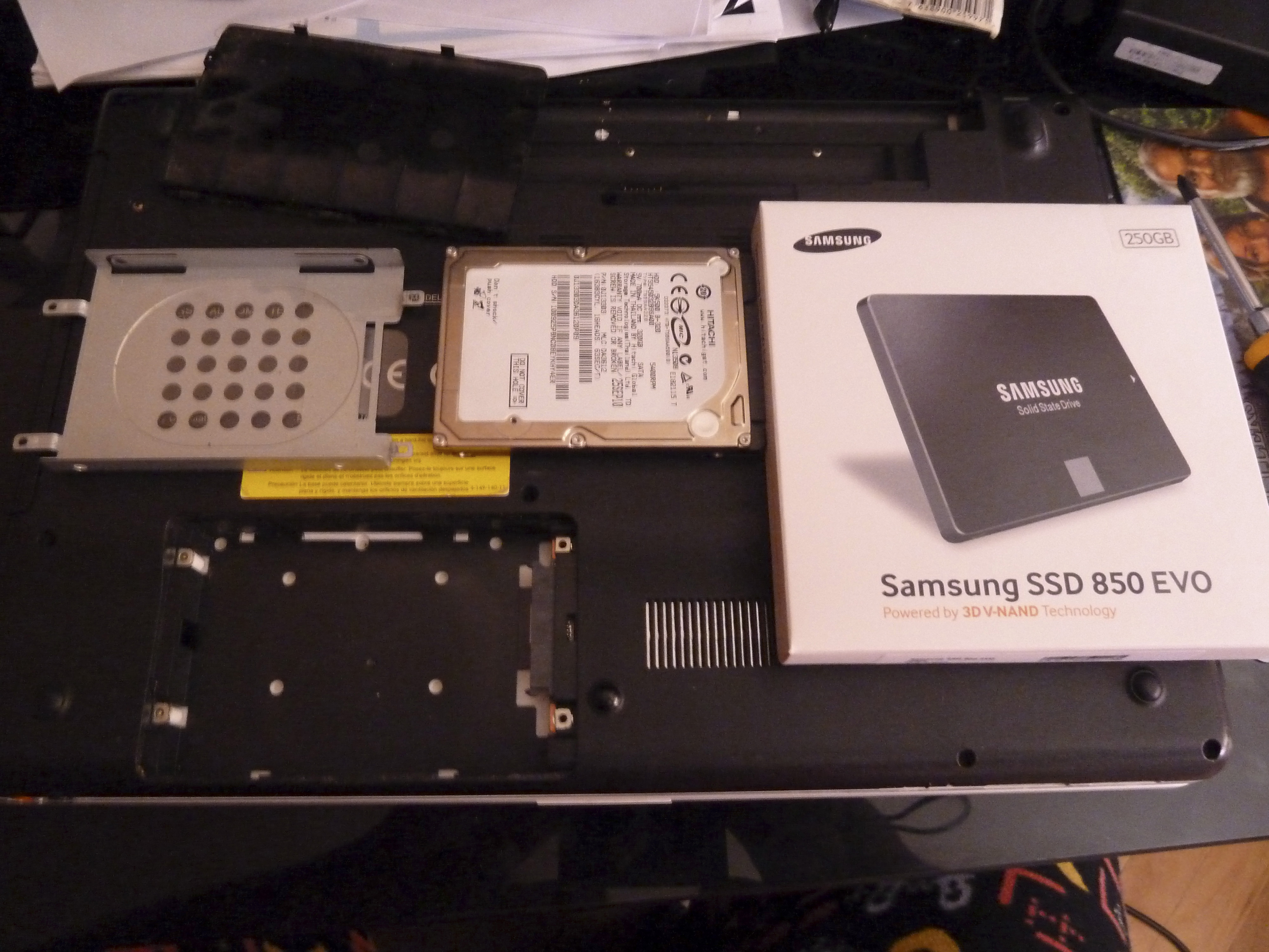En este caso ya había desmontado previamente el HDD, para mirar el grosor, ya que en algunos casos es más grande y se necesita algún tipo de adaptador. En este caso es del mismo tamaño que el SSD. También elegí un SSD SAMSUNG EVO de 250 Gb, porque de 120 se queda al final justo con el tiempo y porque la placa tiene interface SATA 2 y con este disco duro te da garantía el fabricante de que funciona en SATA, SATA2 y SATA 3. A parte las tasas de transferencias son casi las máxima que puede dar un SATA 3, que son unos 520 Mb de lectura y escritura. Al tener la interface SATA 2 lo máximo que va a dar es 250 Mb de lectura y escritura y sobra, más que un disco duro estándar que da de media en un portátil de 60 a 80 Mb por segundo.